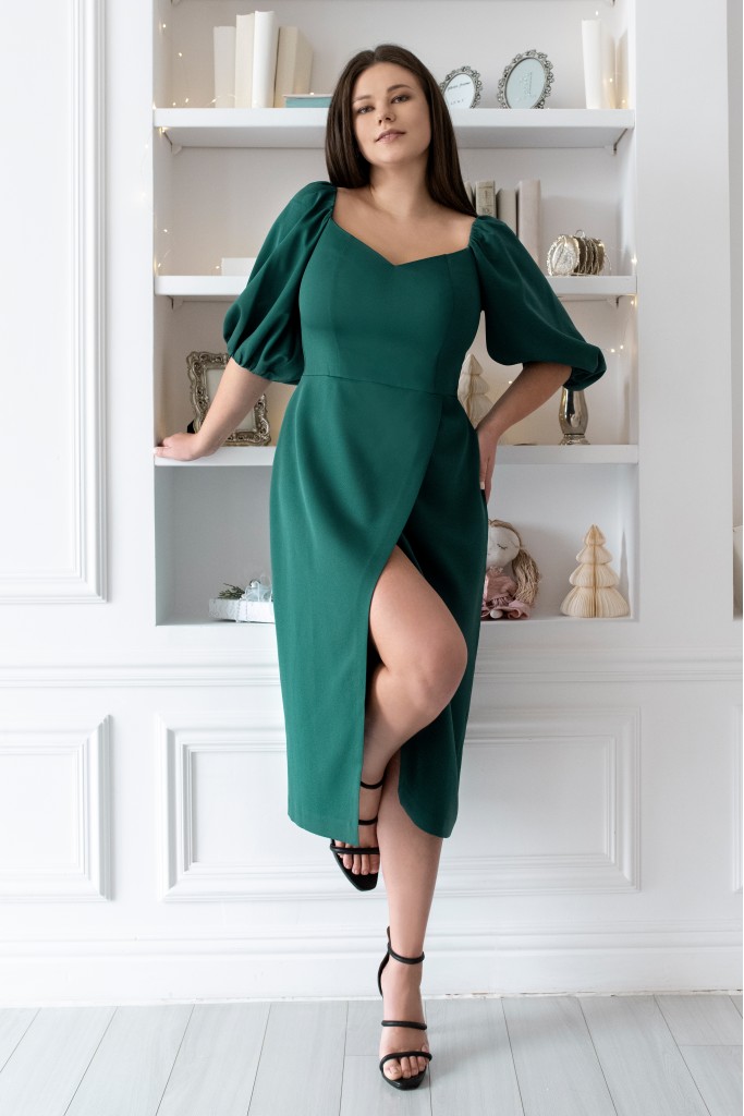 Підготовку до вечірки правильно розпочинати з вибору святкової сукні, і представлений варіант підійде як найкраще. Виріб має міді довжину та щільно прилягає по фігурі. Попереду горловина зроблена з вирізом «каре».