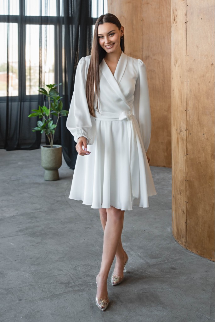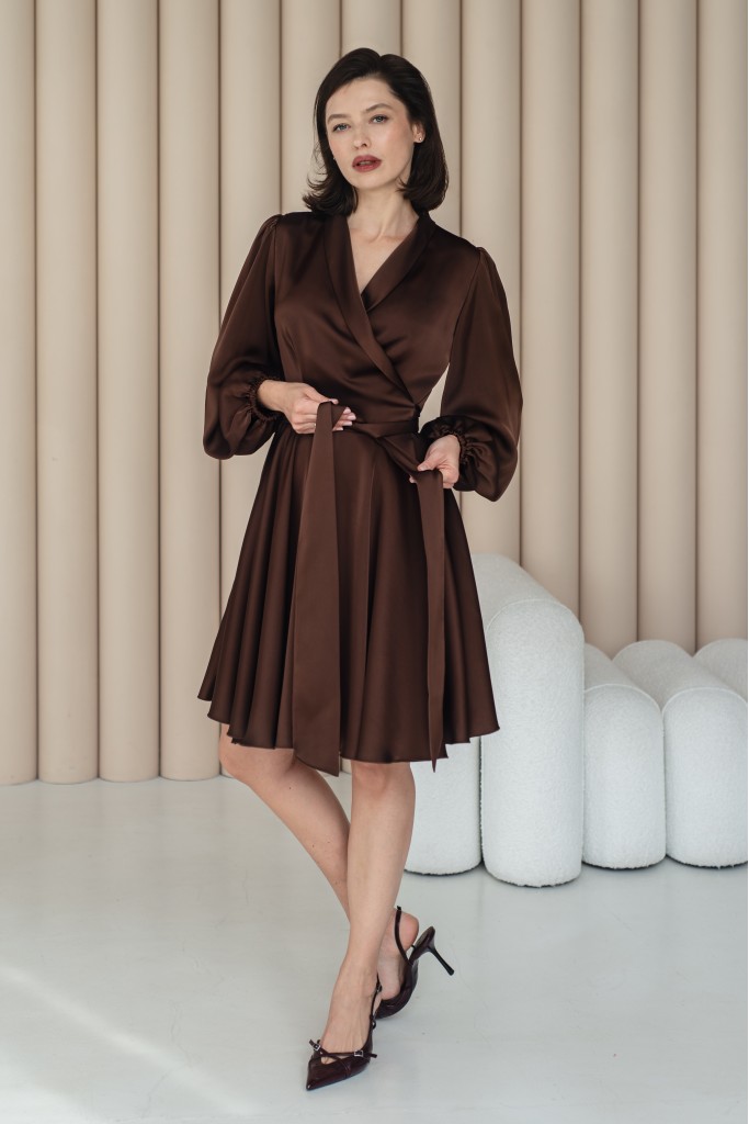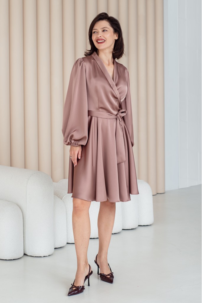 Атласне плаття, що має приталений силует на запах, створить розкішний образ для своєї власниці. Сукня має комір шальку, вточені широкі та довгі рукави, які на кисті призібрані резинкою. Нижня частина, тобто спідниця, викроєна по формі сонце-кльош. На талії сукня регулюється завдяки поясу.