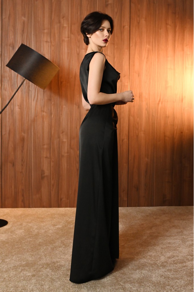 Елегантна довга сукня приталеного силуету з м'яким драпіруванням декольте. Модель має акцент на талії і високий розріз, що підкреслює витончений силует та додає образу жіночності.
