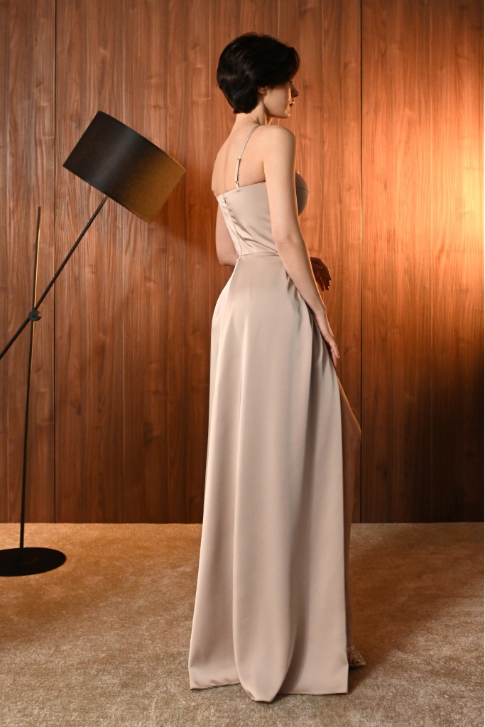 Елегантна сукня максі на тонких бретелях із витонченим декольте. М'яка драпіровка та високий розріз підкреслюють силует, додаючи образу жіночності й розкішної елегантності. Ідеальна для особливих подій.